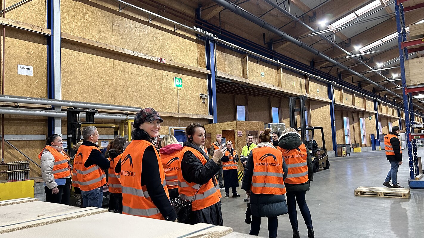 Durch die Lagerhalle führte Afrim Redjepi, Teamleiter im Lager Niederbipp, der vor allem die Vorteile des digitalen Lageführungssystems (LFS) hervorstrich. Die Bauweise des Lagers komplett aus Holz dürfte für zukünftige Projekte in der Ukraine als Anregung dienen, da grössere Gebäude aus Holz in der Ukraine bislang doch eher die Ausnahme sind. Vor Ort verschafften sich alle einen Eindruck von der wichtigen Rolle, die die Meier Logistik unter dem Dach der Kuratle Group einnimmt. Beim ergänzenden Besuch im Showroom versorgte Michael Marbet, Verkaufsberater Innendienst, die Gruppe mit Detailkenntnissen zum Boden- und Türensortiment unserer Handelsgesellschaft Kuratle & Jaecker.