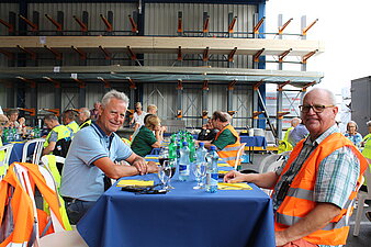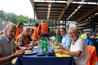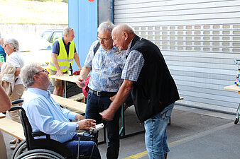 Gegen 11.45 Uhr war es Zeit für eine Stärkung. Das Essen wurde draussen serviert, an dem Ort, an dem normalerweise die LKWs ihre Waren auf- und abladen. Aufgetischt wurden verschiedene Salate, Kartoffeln, Grillgerichte und Desserts. Im gemütlichen Rahmen tauschten sich die Gäste während des Mittagessens über die alten Zeiten und die Geschehnisse der vergangenen Jahre aus.