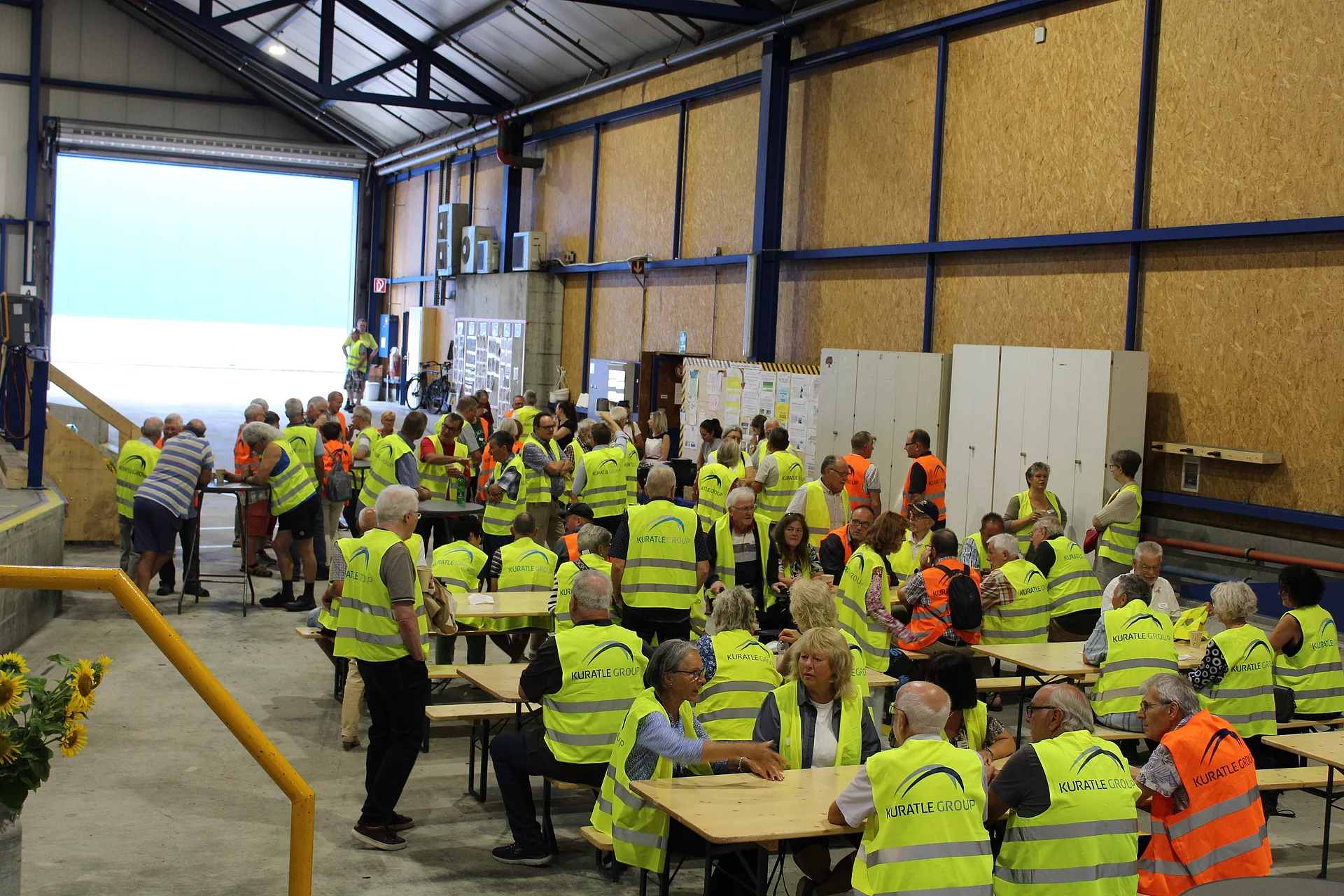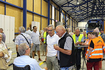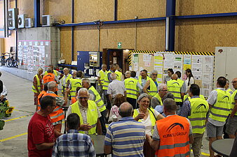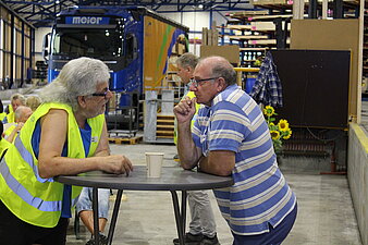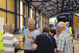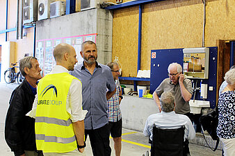 Der Tag begann gegen 9 Uhr mit dem Eintreffen der ersten Teilnehmenden. In der Halle 1 wurde den ehemaligen Mitarbeitenden Kaffee und Gipfeli serviert. George Kuratle, Verwaltungsratspräsident, und Roger Kuratle, CEO der Kuratle Group, begrüssten die Anwesenden herzlich. Nach dem gemütlichen Austausch über die früheren Zeiten bei der Kuratle Group bei Kaffee und Gipfeli dankten George und Roger den Gästen für ihr zahlreiches Erscheinen und informierten über das geplante Tagesprogramm. Alle Teilnehmenden wurden zudem aufgefordert, zu schätzen, wie viel sie zusammen wiegen und die geschätzte Zahl auf ihr Namensschild zu schreiben. Wie dieses unterhaltsame Rätselraten ausging – dazu gleich mehr.