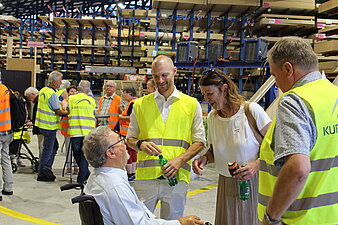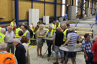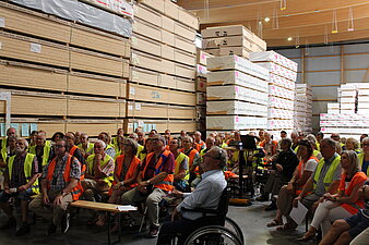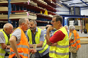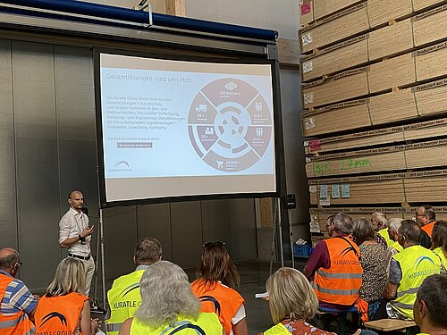 Nachdem die etwa 70 Teilnehmenden mit Kopfhörern ausgestattet waren, informierte Hanspeter Gerber, CEO Kuratle Immobilien, anhand von verschiedenen Kennzahlen, wie sich das Familienunternehmen in den letzten Jahren entwickelt hat. Anschliessend führte er die Gruppe durch die Halle 1 und gab einen Überblick über das tägliche Geschehen der Mitarbeitenden von der Meier Logistik im Lager. Der erste Teil des Rundganges führte zur Absauganlage und durch die Arbeitshalle unseres Tochterunternehmens HTA Mittelland, wo unter anderem die Abbundanlage in Aktion zu sehen war.