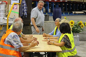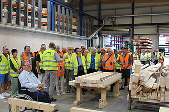 Nach der Mittagspause ging es zunächst zur grossen LKW-Waage. Nun kam die Zahl ins Spiel, die zu Beginn des Tages auf das Namensschild geschrieben worden war. Alle Teilnehmenden stellten sich gemeinsam auf die Waage und warteten gespannt auf das Ergebnis. Insgesamt wogen sie 6250 Kilogramm. Elizabeth Schneider hatte mit ihrer Schätzung von 6260 Kilogramm am besten getippt. Wir gratulieren Elizabeth Schneider zum Gewinn eines Reka-Checks. Danach ging es zum zweiten Teil des Rundganges. Die Teilnehmenden wurden durch unsere grossen Lagerhallen geführt, vorbei an hohe Stapel mit Holz. Zum Abschluss führte Hanspeter Gerber die Gruppe durch unser Bearbeitungs- und Zuschnittzentrum (BUZ), wo sie die CNC-Maschinen in Aktion erleben konnte. Der Rundgang endete in Halle 9, wo bereits ein weiteres Highlight wartete.