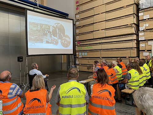 Nach dem Rundgang blickte George Kuratle in seiner Präsentation auf die Entwicklung des Familienunternehmens zurück und erzählte Geschichten über vergangene Ereignisse, Messen und Reisen. Er erinnerte an die ersten Messeauftritte an der Holz und der Swissbau im Jahr 1957, die erste Wood Conference 2004 sowie den Mitarbeitenden Ausflug in den Europa Park in Rust anlässlich des 65-jährigen Jubiläums. Dabei nahm er immer grossen Bezug auf die Teilnehmenden, die sich auf den gezeigten Bildern teilweise wiedererkennen konnten.