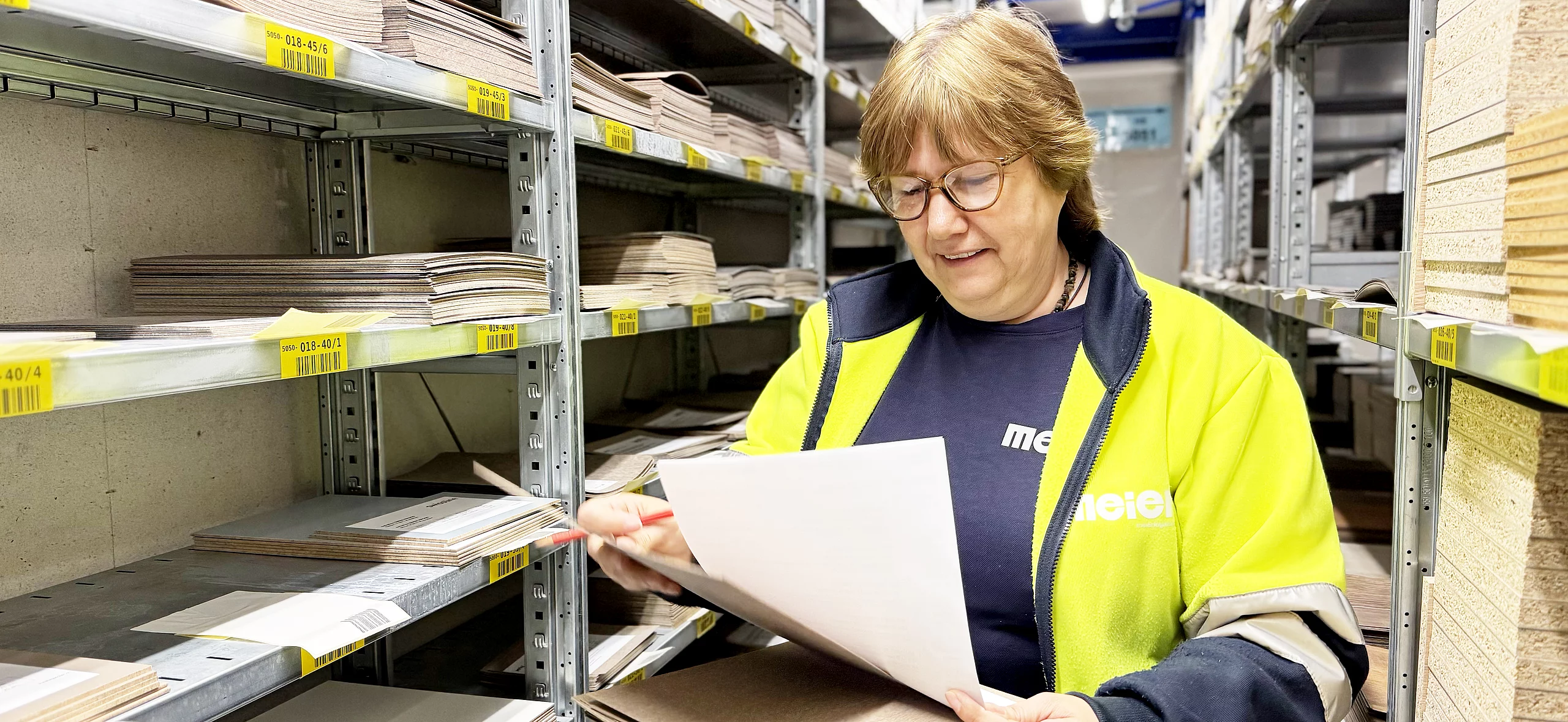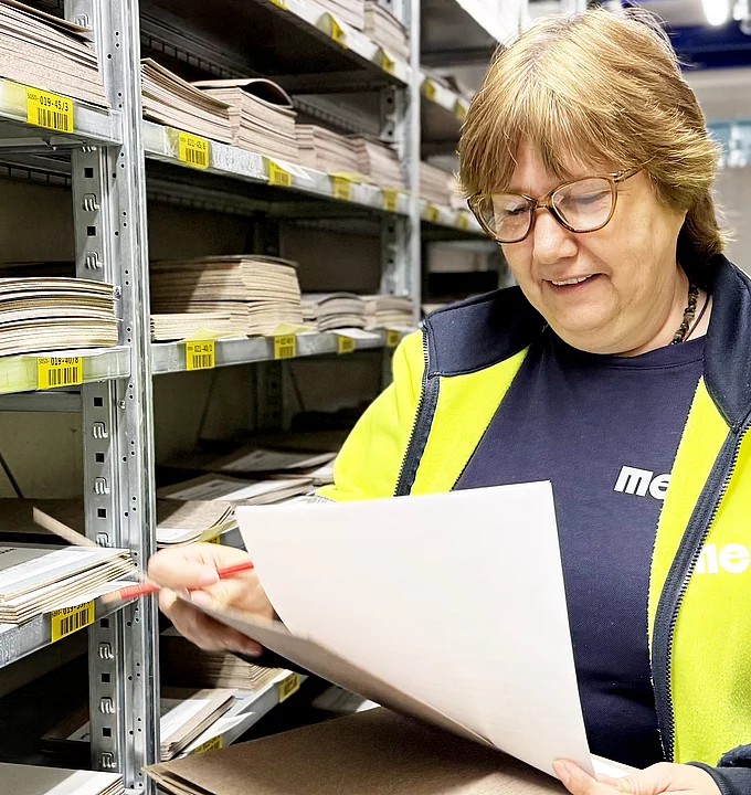 Verantwortlich dafür, dass dieser Logistikprozess reibungslos funktioniert und unsere Kunden die Muster pünktlich per Post erhalten, ist die Logistikerin bei der Meier Logistik.