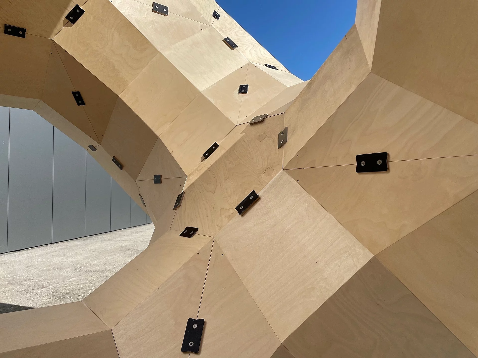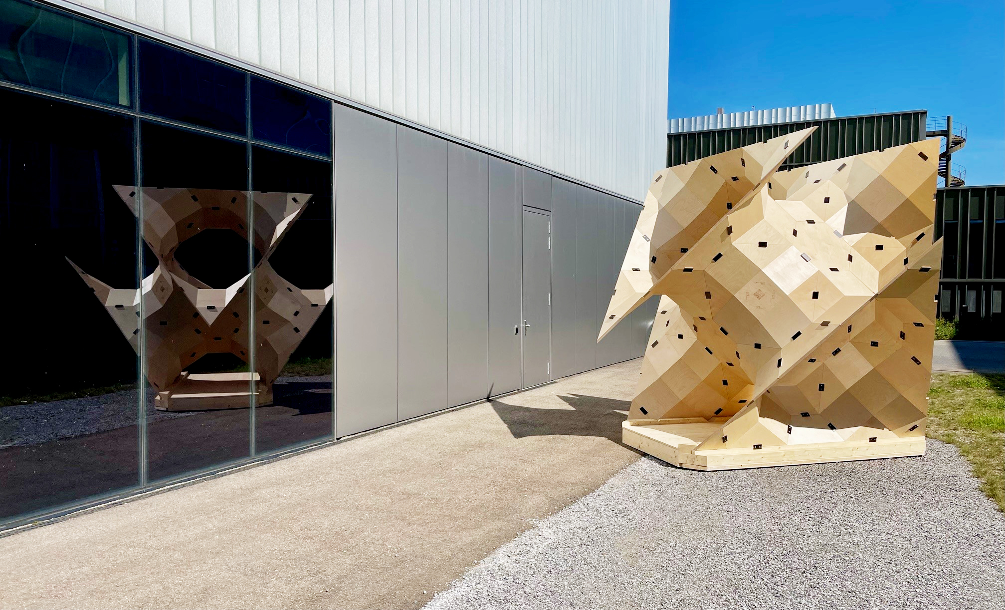 Die Bearbeitung wurde auf einer 5-Achs CNC Maschine durch unsere erfahrenen CNC-Maschinisten ausgeführt. Drei Mitarbeitende (Schreiner) sorgten für die präzise Montage und Fertigstellung des Kunstwerks. Während der Montage wurden die Platten zusätzlich mit UV-Schutz versehen. Für das Werk wurden ausserdem Berechnungen angestellt, damit es Windlasten standhält und Traglasten verträgt – beispielsweise wenn Personen hineinklettern würden. Die erfolgreiche Projektleitung im Bearbeitungs- und Zuschnittzentrum (BUZ) hatte Daniel Schmidt, Teamleiter CNC Bearbeitung. Trotz ihrer komplexen Form besteht die Skulptur aus komplett identischen Elementen, die aus je neun planaren Holzteilen verleimt wurden und mit lösbaren «Butterfly»-Verbindern (im Bild Schwarz) zusammengehalten werden. Mit einigen zusätzlichen drei-, vier- und sechseckigen Teilen entsteht aus nur sieben verschiedenen Bauteilen aus insgesamt 160 Teilen diese überraschende Geometrie.