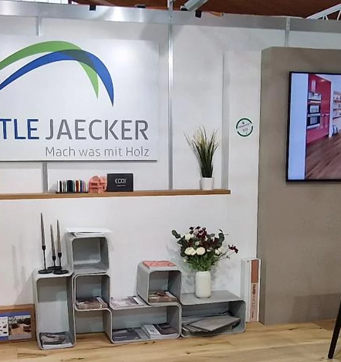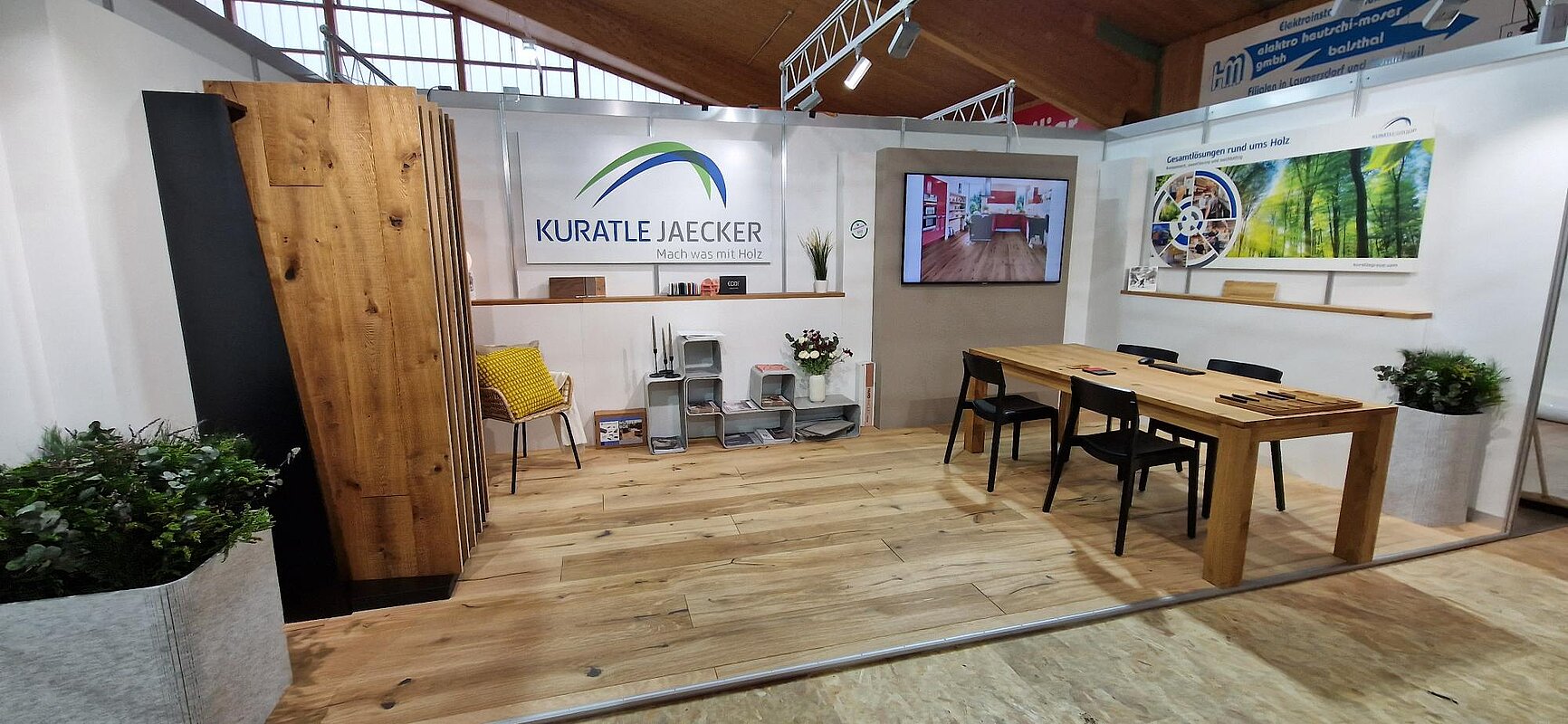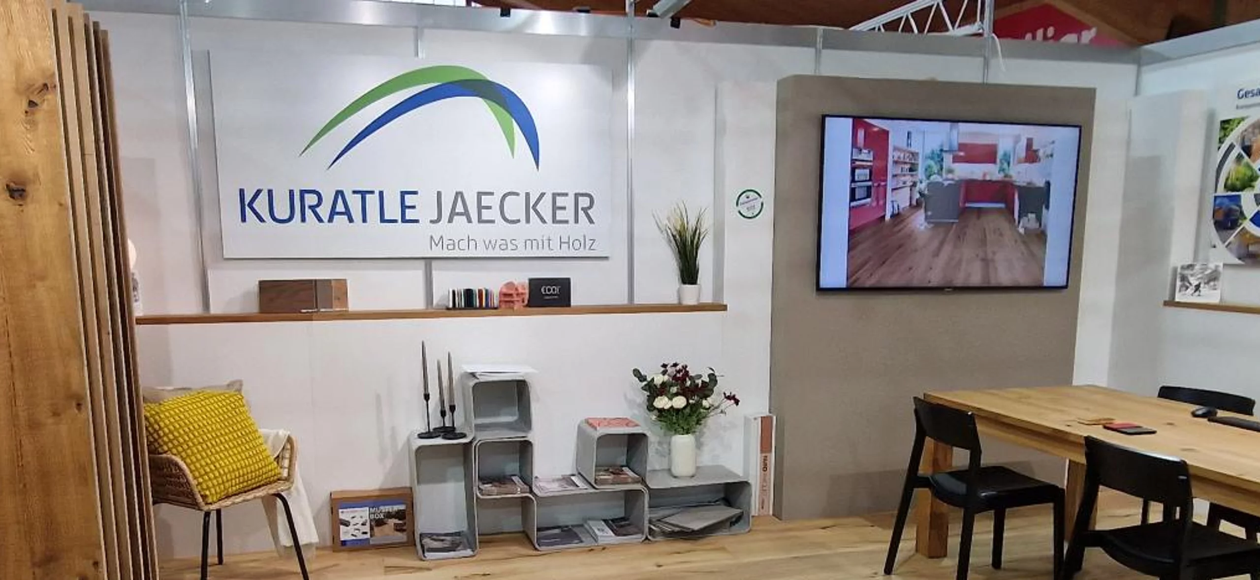 inen guten Überblick über das weitere Bodensortiment von Kuratle & Jaecker bot ein Parkettständer, der einen bunten Querschnitt durch unsere Produkte zeigte. Auch präsentierten wir einige hervorragende Akustiklösungen, zum Beispiel Produkte von ECOcero, die wie Blumentöpfe aussehen. Das verblüffende Design macht nicht nur optisch etwas her – es trägt auch dazu bei, störende Geräuschpegel zu senken. Wirksame Wandlösungen waren mit Acous vertreten, dekorative Platten mit Shinnoki.