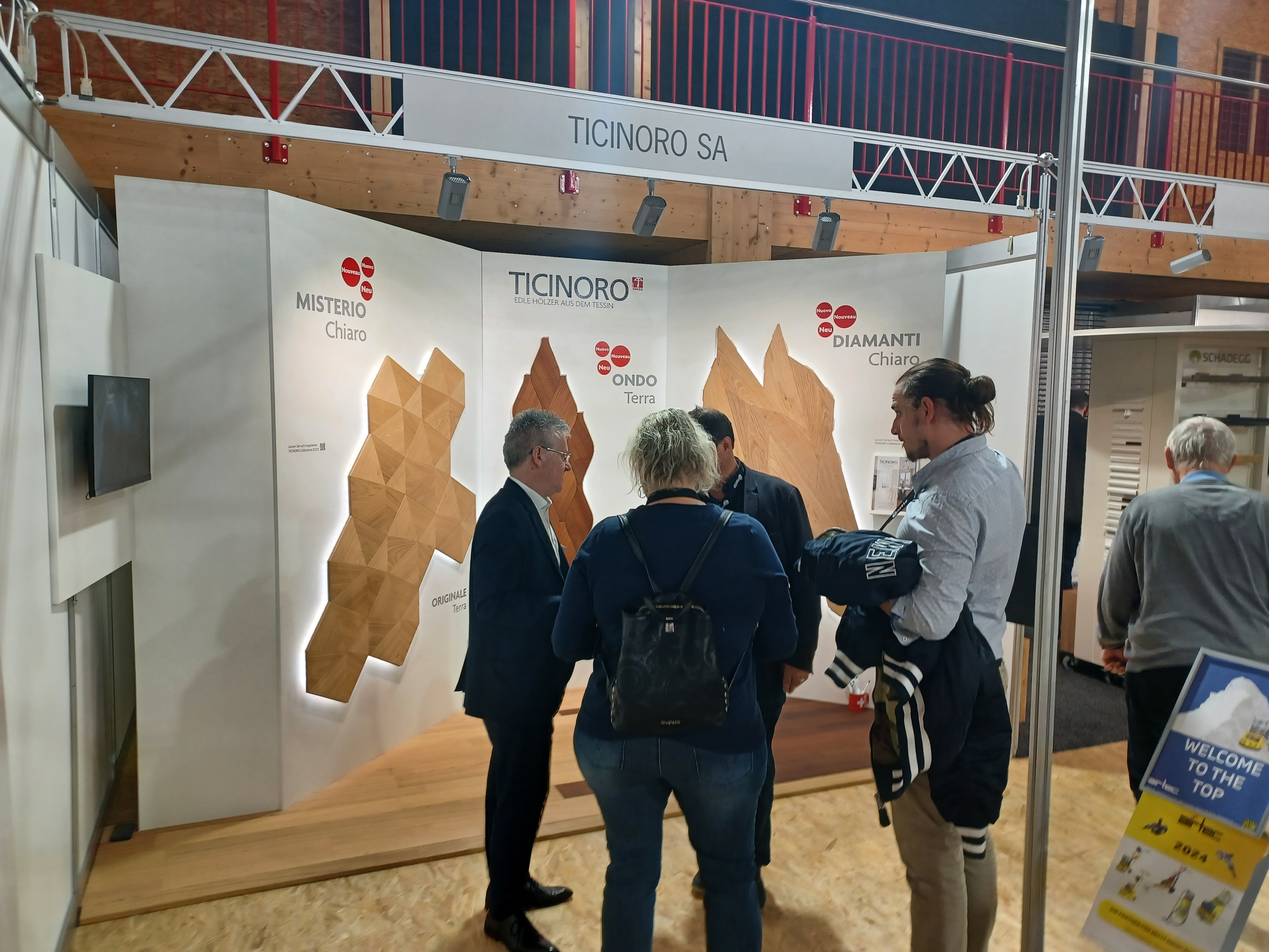 Luxuriös wurde es am Stand von Ticinoro, wo wir das Fachpublikum über unser Swiss-Made-Parkett aus Edelkastanie sowie über Endbearbeitungsmöglichkeiten informierten. Vorgestellt wurde die gesamte Kollektion. Innenarchitekten und Innenarchitektinnen oder Parkettleger konnten sich aber auch einen Eindruck davon verschaffen, dass jede «Famiglia» in verschiedenen Holzarten erhältlich ist (neben Edelkastanie auch Eiche, Esche, Ahorn, europäischer und amerikanischer Nussbaum, Fichte oder echtes Altholz aus Eiche oder Fichte). Ein weiterer Akzent lag darauf, die individuelle Manufakturierung von Sonderformen oder Sondermassen vorzustellen – Design auf Kundenwunsch ist mit Ticinoro jederzeit möglich. Es waren gerade Designfragen wie diese, über die wir unsere Gäste an beiden Tagen ausführlich beraten durften. Auch hier bedanken wir uns bei allen Besuchenden und schauen auf einen erfolgreichen Auftritt an der netto-Messe 2024 zurück.