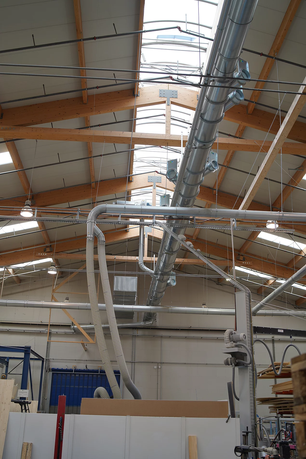 Das Bearbeitungs- und Zuschnittzentrum (BUZ) darf auf ein stetiges Wachstum des Maschinenparks in den vergangenen Jahren zurückblicken. Nebst der Investition in verschiedenste Holzbearbeitungsmaschinen standen wir vor der Aufgabe, die Prozesse und die benötigte Infrastruktur dem Maschinenpark anzupassen. Nebst der Druckluft, der Stromversorgung usw., galt das zum Beispiel auch für die Kapazität der Absauganlage für Staub und Späne. Nachdem die zentrale Druckluftstation Anfang 2023 in Betrieb genommen worden war, stand jetzt der Bereich der Absaugung an.