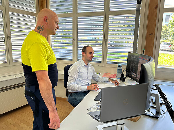Roger Schwendener, Leiter Verkauf Innendienst, und Cédric Barmettler, Verkaufsberater Innendienst Boden, bilden das Verkaufsteam. Beide sind gelernte Bodenleger. Warum es Cédric in den Verkauf zog? «Ich wollte den Markt spüren», sagt er. «Was möchten die Kunden? Wie entwickeln sich Marktpreise?» Um Fragen wie diese kümmert sich der Verkauf heute.