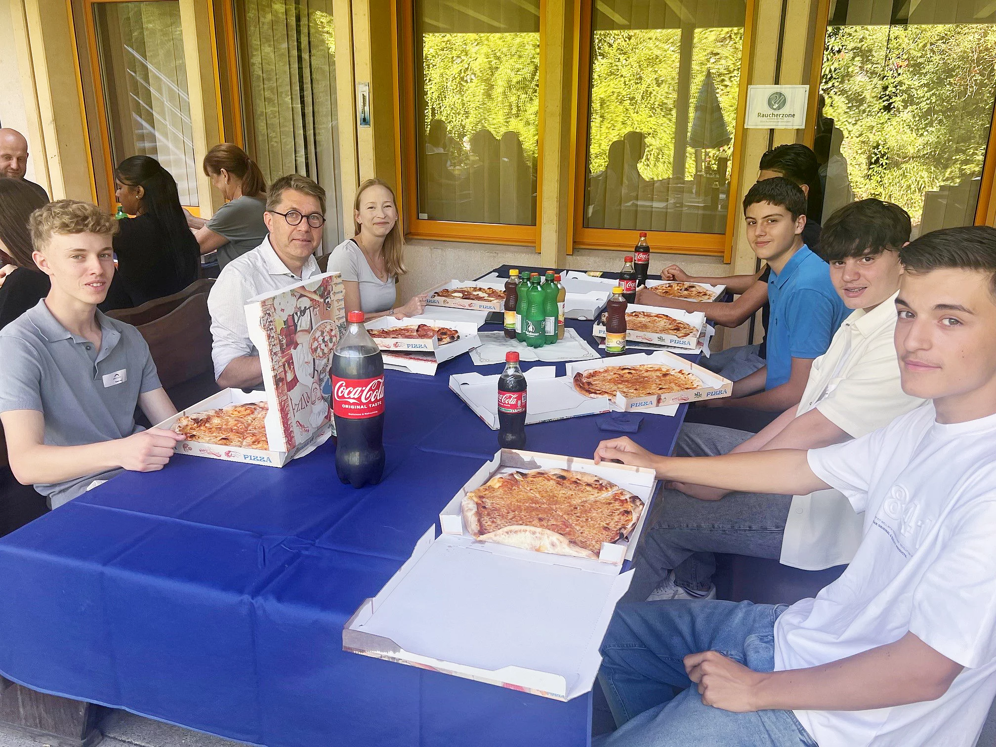Nach dem einstündigen Rundgang wurden sie mit einer feinen Pizza belohnt. Nach dem Mittagessen bestand die Möglichkeit sich mit unserer Lernenden Nithusha Raveendran (KV Lernende Füllinsdorf 3. Lehrjahr) auszutauschen. In einer offenen Fragerunde teilte sie ihre Erfahrungen, gab wertvolle Tipps und sprach über Herausforderungen und Erfolgserlebnisse während ihrer Ausbildung. Diese Einblicke aus erster Hand wurden von den neuen Lernenden sehr geschätzt und trugen dazu bei, ihnen mögliche Unsicherheiten zu nehmen. Zum Abschluss des Tages versammelten sich alle Teilnehmer zu einer gemeinsamen Feedbackrunde, in der die Eindrücke des Tages reflektiert wurden. Die positive Resonanz der Lernenden zeigte, dass der Willkommenstag ein voller Erfolg war. Sie äusserten sich begeistert über die herzliche Aufnahme und die vielfältigen Einblicke, die sie vom Unternehmen gewinnen konnten.