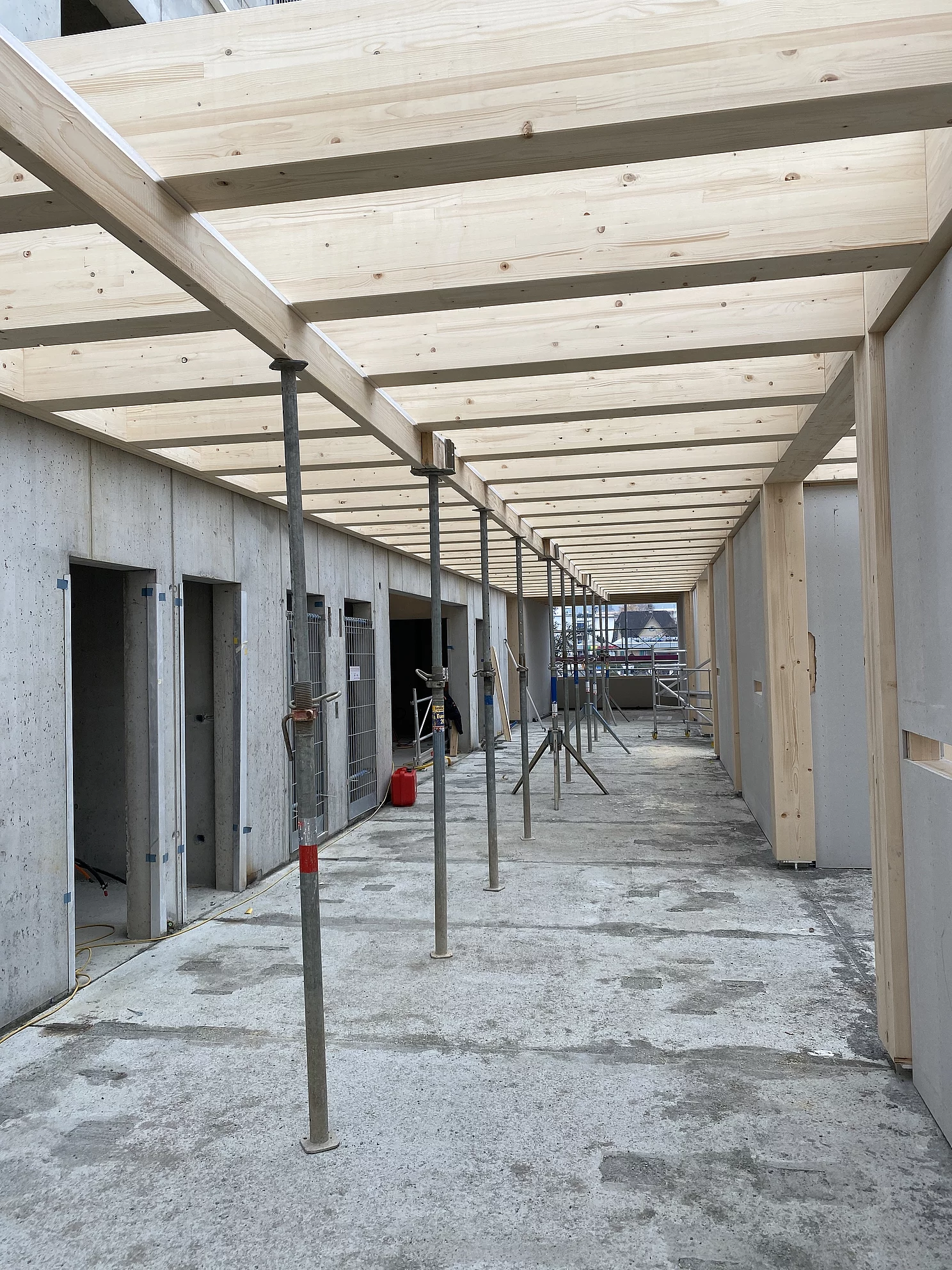 Die hybride Deckenkonstruktion wurde im Wilma-System ausgeführt. Sie besteht aus 36 – 44 Zentimeter hohen Brettschichtholzrippen im Verbund mit zehn Zentimeter starken vorfabrizierten Betonelementen. Ohne weitere Aussteifungen werden die Horizontalkräfte über die HBV-Decke in den Gebäudekern übertragen. Das Wilma-System ermöglicht nicht nur einen raschen Baufortschritt, sondern spart auch Raumhöhe. Zwischen den Trägern wurden Akustik und Lichtelemente verbaut und lokal Haustechnikinstallationen angebracht. Im Komplex Magazin der Halter AG (Ausgabe Nr. 15, Juni 2022) lässt sich Simon Kellenberger, Projektleiter Lussi + Partner AG wie folgt zitieren: «Dadurch haben wir die baurechtlich mögliche Gebäudehöhe optimal ausgenutzt und konnten ein Maximum an Stockwerken realisieren. Dies wiederum half dabei, den Fussabdruck des Gebäudes auf dem Grundstück zu verkleinern.»