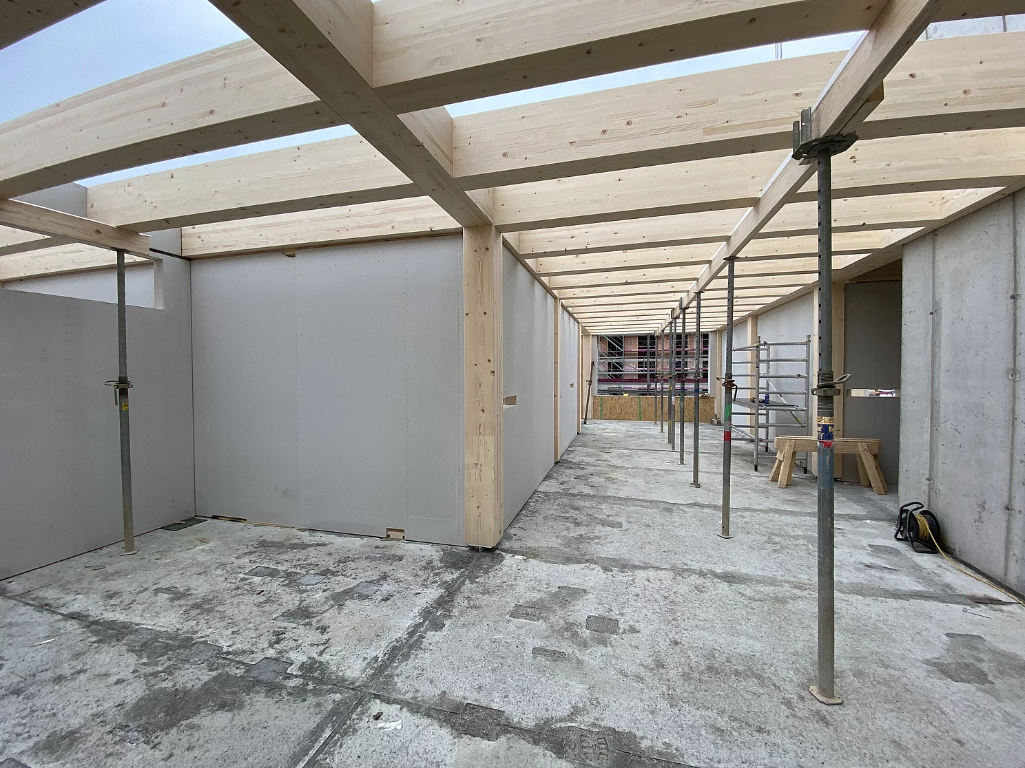 Das Untergeschoss sowie der Gebäudekern mit Treppenhaus, Lift und Erschliessungszonen für die Haustechnik, wurden in Massivbauweise erstellt. Im November und Dezember 2021 wuchsen die fünf oberirdischen Geschosse mit einer Gesamtfläche von 3400 Quadratmetern innert weniger Wochen rasant in die Höhe. Das Team der Holzbaufirma Häring AG, unter der Leitung von Oliver Hasler und Joe Eicher, hat den Holzbau in beeindruckender Geschwindigkeit und Präzision aufgerichtet. «Damit eine minimale Bauzeit erreicht werden kann, ist der durchgängige Vorfertigungsgrad der gesamten Konstruktion absolut entscheidend. Unter anderem hat uns dieser Aspekt beim Wilma System überzeugt», sagt David Häring, Leiter Verkauf Holzbau & GU.