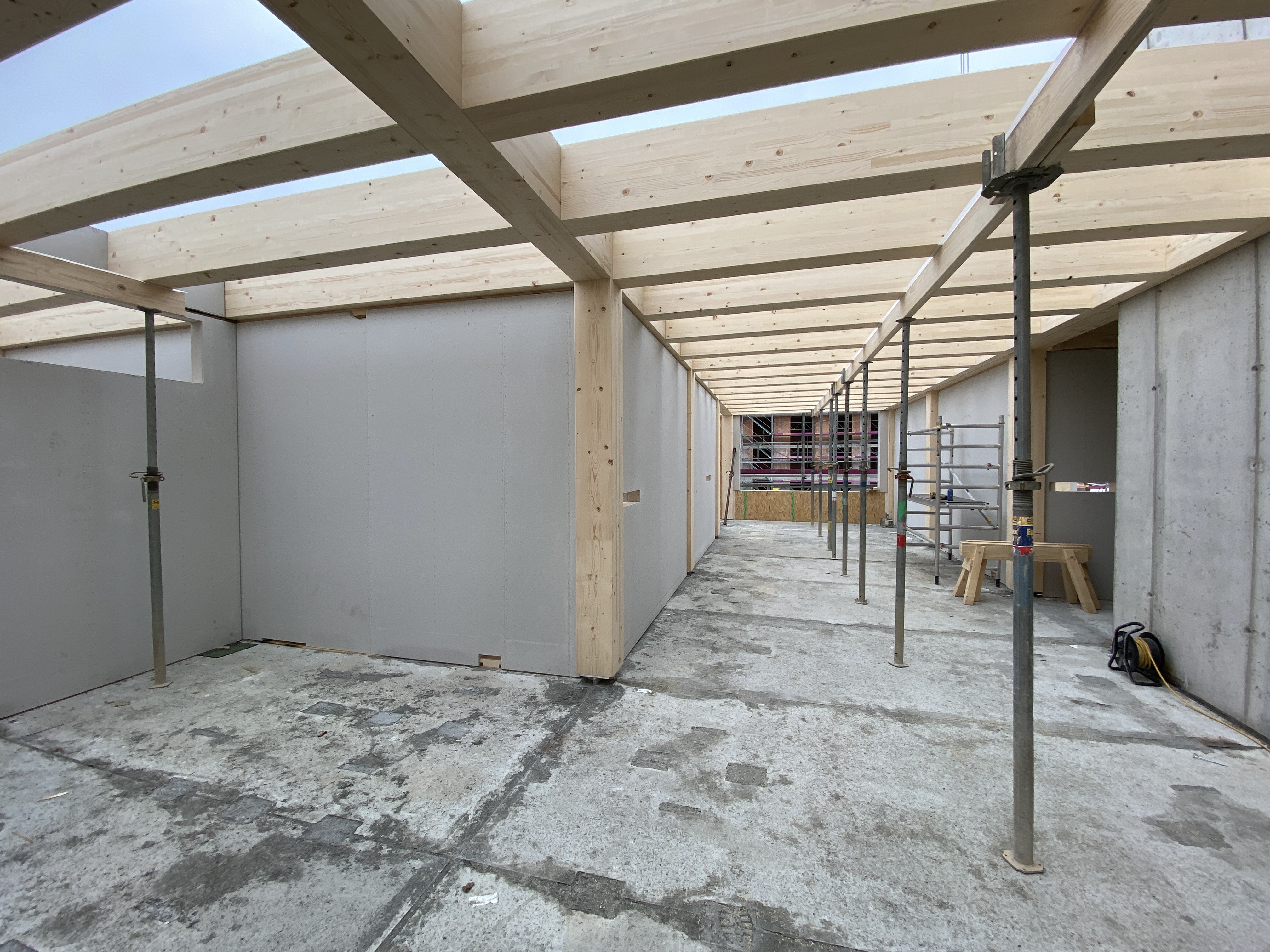 Was bei den Holzbauelementen längst Standard ist, kann durch den Einsatz von Wilma nun auch bei hybriden Holz-Beton-Verbunddecken erreicht werden. Beim Wilma HBV-System werden vorfabrizierte Betonelemente mit den Holzbauteilen kraftschlüssig verbunden. Dadurch entsteht kaum Baufeuchtigkeit und die Austrocknungszeiten entfallen. Pro Geschoss wurden 15 Lastwagenladungen mit rund 450 Holzbauteilen sowie 70 Betonelementen verbaut.