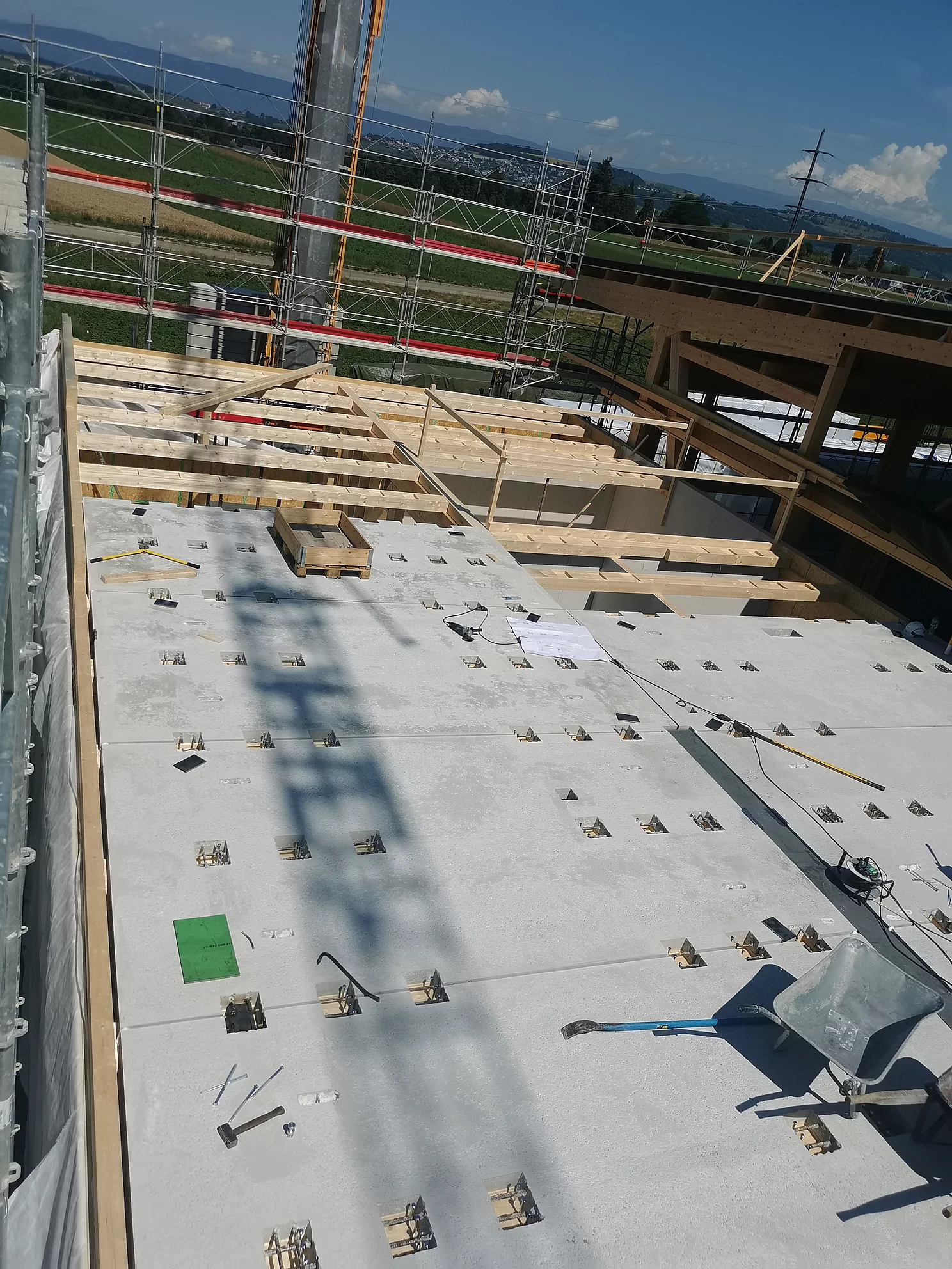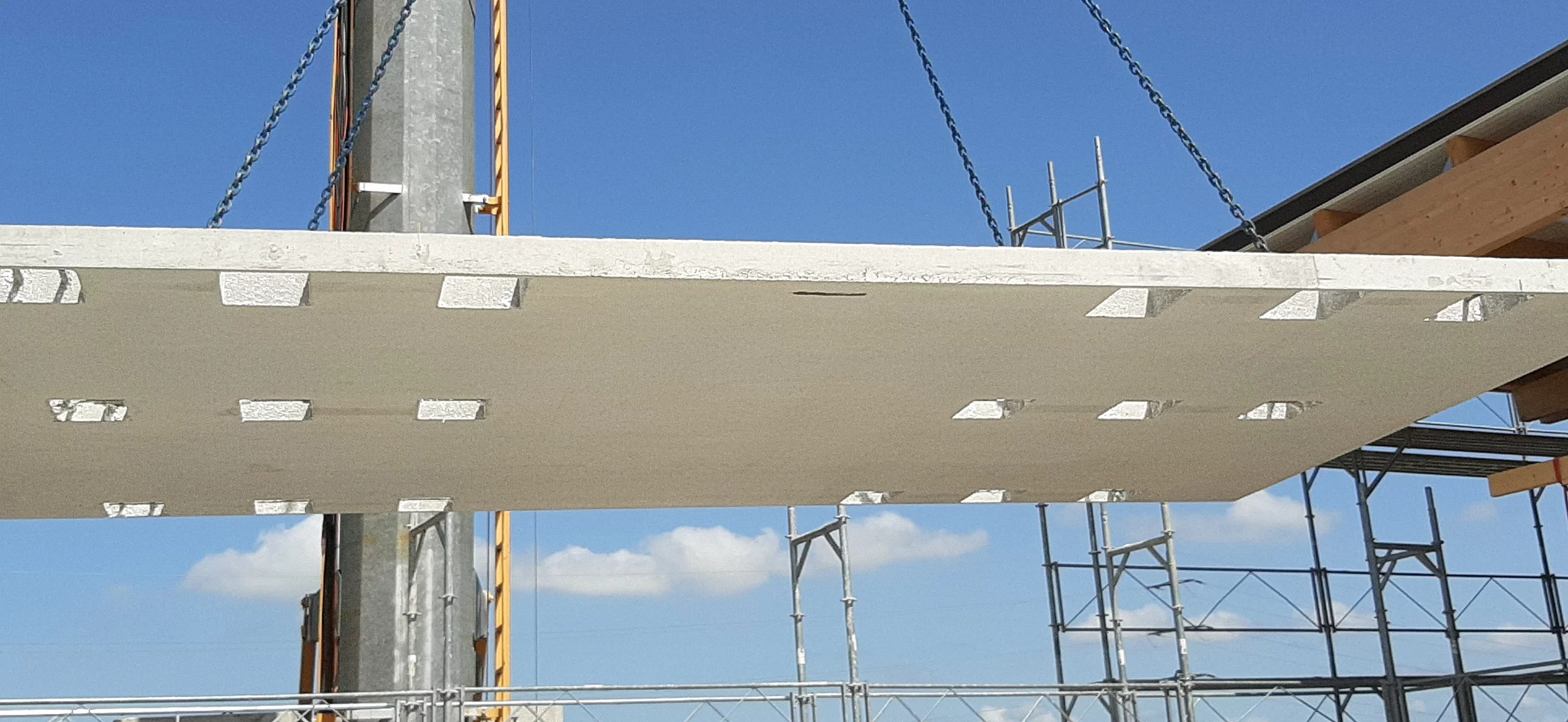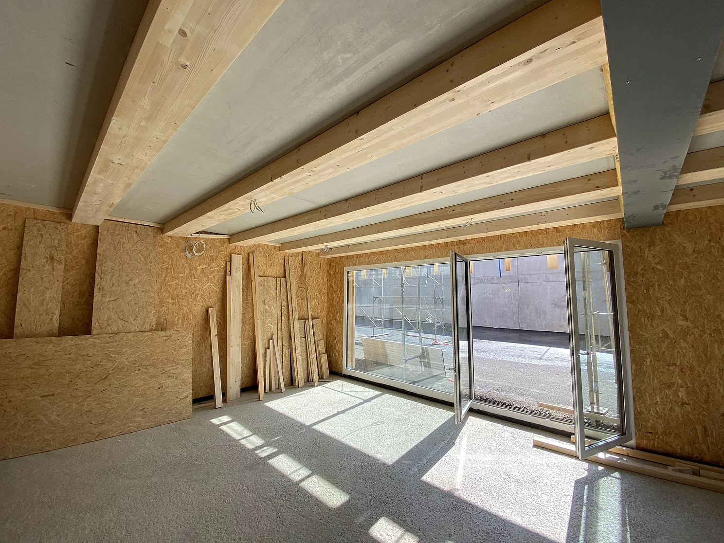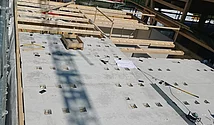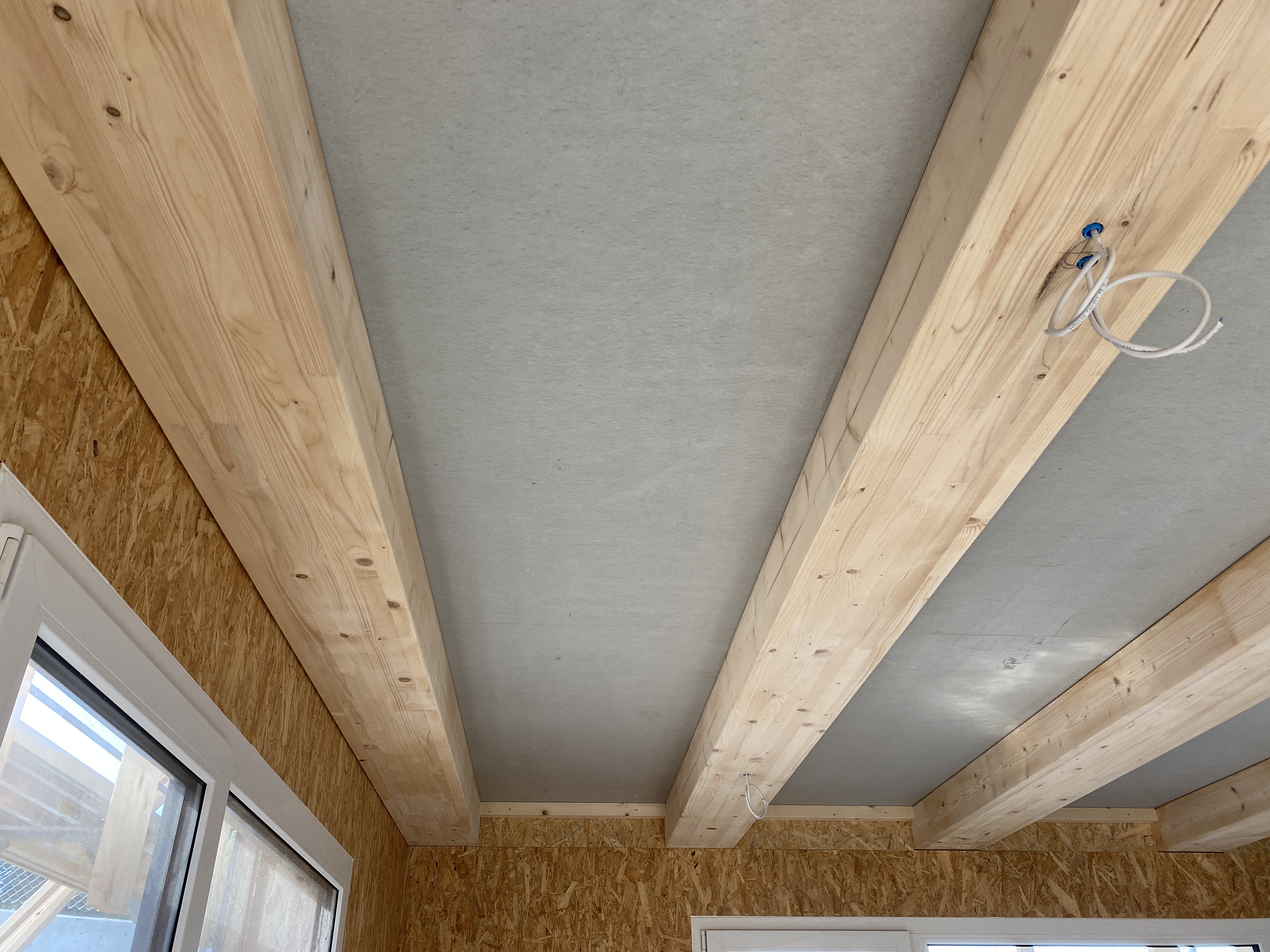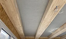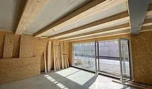 Die Decken des zweigeschossigen Bürotrakts wurden mit dem Wilma-System ausgeführt. Um die Deckenaufbauhöhe zu minimieren, wurden die Brettschichtholzträger (160x280mm) liegend versetzt. Mit einem Balkensprung bis 1.40m entstand ein enorm materialeffizienter und dennoch technisch hochwertiger Neubau.